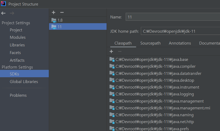 SDK: 부분을 11 버전으로 변경한다. (자신이 사용할 버전으로 변경해주면 된다.)
