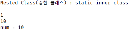 System.out.println("Nested Class(중첩 클래스) : static inner class\n");