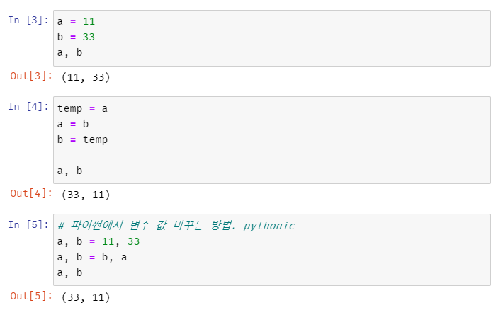 그러나 파이썬에서는 In [5]에 보이는 것과 같이 간단하게 두 변수의 값을 바꿀 수 있다.
