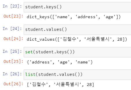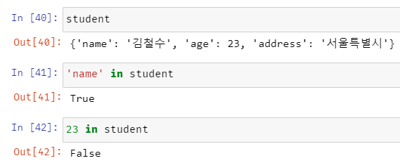 따라서 In [42]에서 23이라는 value 값은 있지만 key가 아니므로 False가 반환되는 것이다.