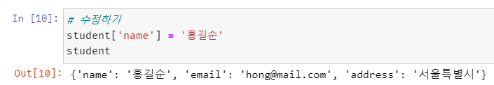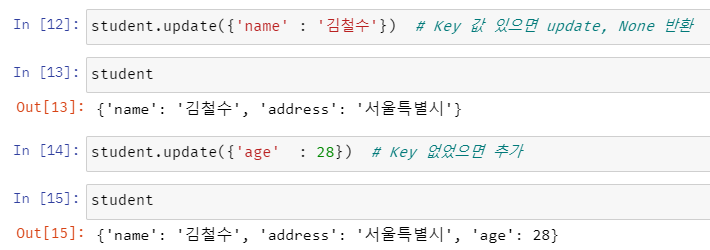 update() 함수를 사용해서 dict에 새로운 요소를 추가하거나 기존 요소를 수정할 수 있다.