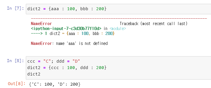 없는 변수를 key 값으로 두려는 경우 In [7]에서와 같이 NameError가 발생한다.