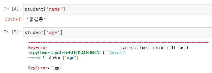 이 방법으로 value 값을 가져올 때, 없는 key로 접근하려하는 경우에는 KeyError가 발생한다.