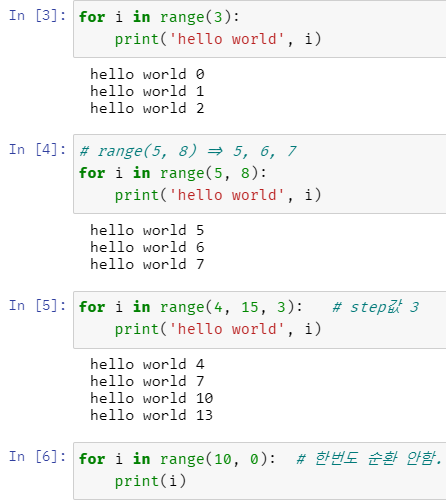 위 같은 형태가 다른 언어에서 for (int i = 0; i < 3; i++) { .. } 형태인 것이다.