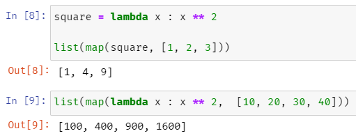 매개변수 값을 제곱한 뒤 리턴하는 square() 함수를 만든 뒤 map() 함수의 첫 번째 인수로 넣었다.