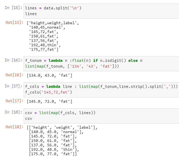 In [17]에서는 map() 함수를 이용해 매개변수로 들어오는 값들에 f_tonum 함수를 적용시키고, 그렇게 변경된 데이터들을 list 형태로 반환하는 lambda 함수 f_cols를 생성한다. (혹시 모를 경우를 대비해 strip() 함수를 이용해 들어오는 값의 앞뒤 공백을 삭제해준다.)